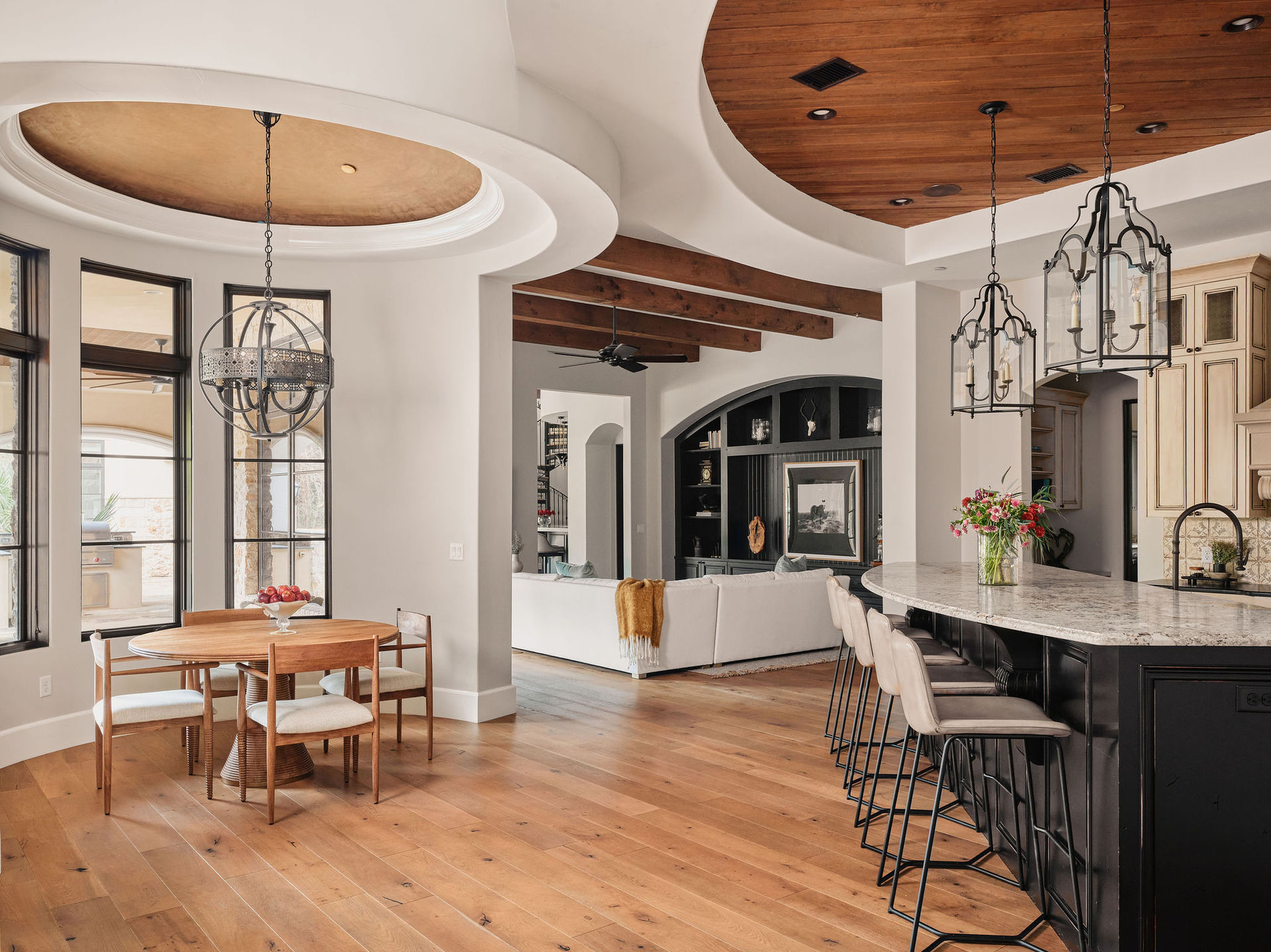 Approaching along the hand-laid paver drive, the setting reads like a prelude: graceful oaks arch overhead, framing an entrance both noble and welcoming. Stepping inside, the floorplan flows with a lyrical rhythm—open spaces balanced by intimate architectural corners and heirloom-quality finishes that nod to timeless craftsmanship. Ceilings become art forms: hand-painted, carved, or shaped to mirror the curves beneath them. The devotion and expert design that shape this home are on display everywhere: from the wide-plank European oak and travertine floors to the meticulously carved wood-domed ceilings to the hand-stuccoed walls and archways that are connected by entire walls of floor-to-ceiling doors and windows at every turn.