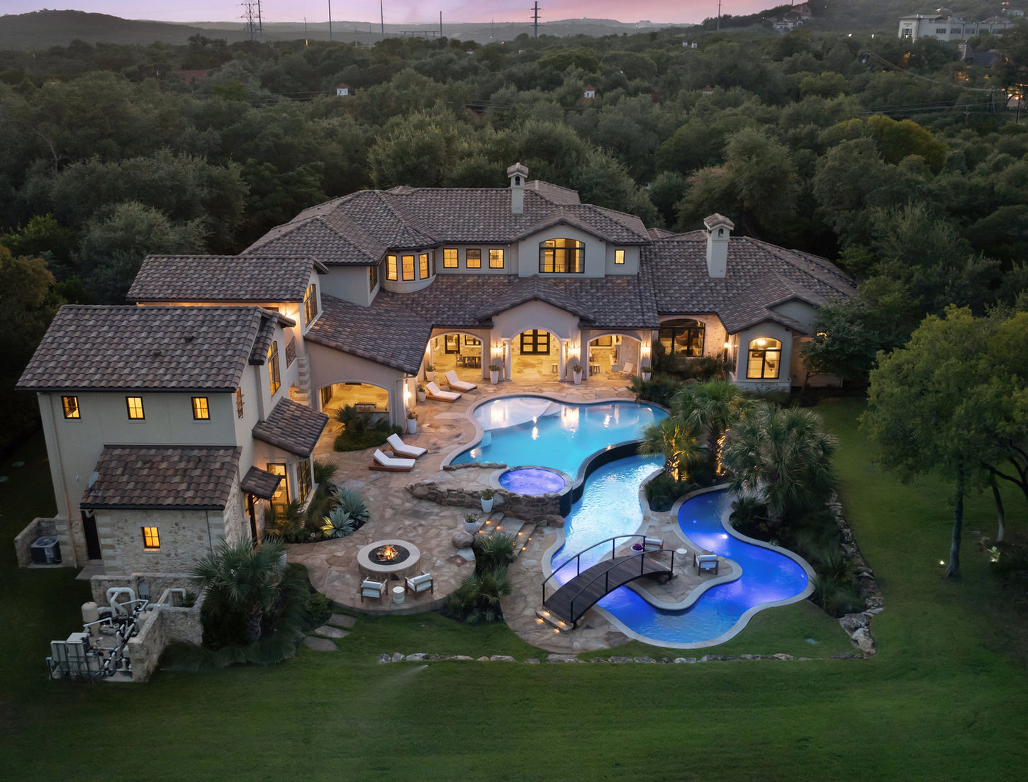 3 Fireplaces, including Dual Side Fireplace, Fireplace in Library and Outdoor Fireplace